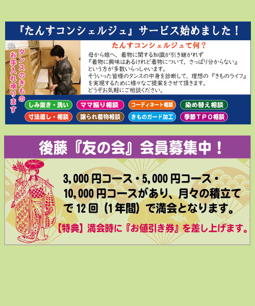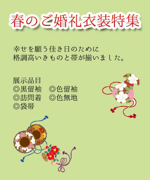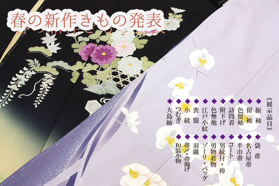 春のお出かけが楽しくなるシンプルモダンなきものと帯、お茶席のきもの、成人式にふさわしい振袖や帯、格調高い正装用のきものなどを展示いたします。