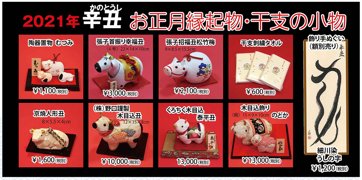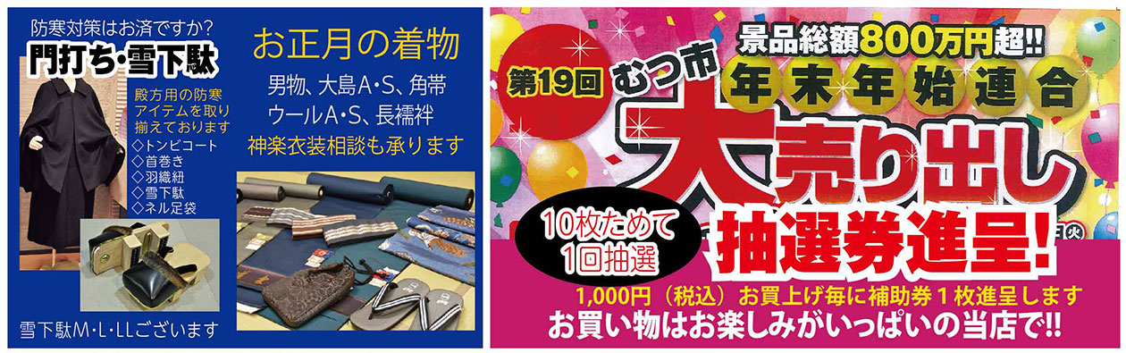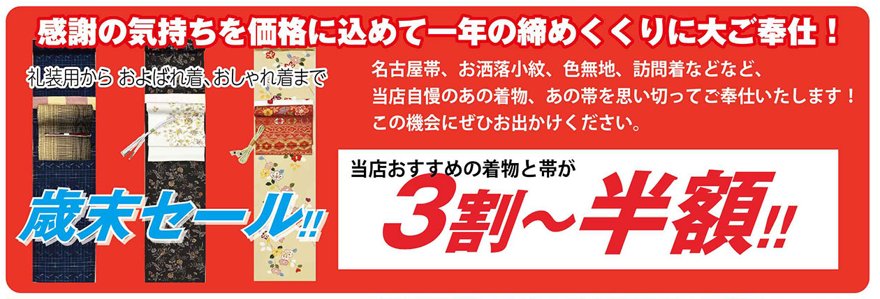 おすすめのきものや帯が3割〜半額!お正月の縁起物・干支小物も店頭で紹介をしています。
